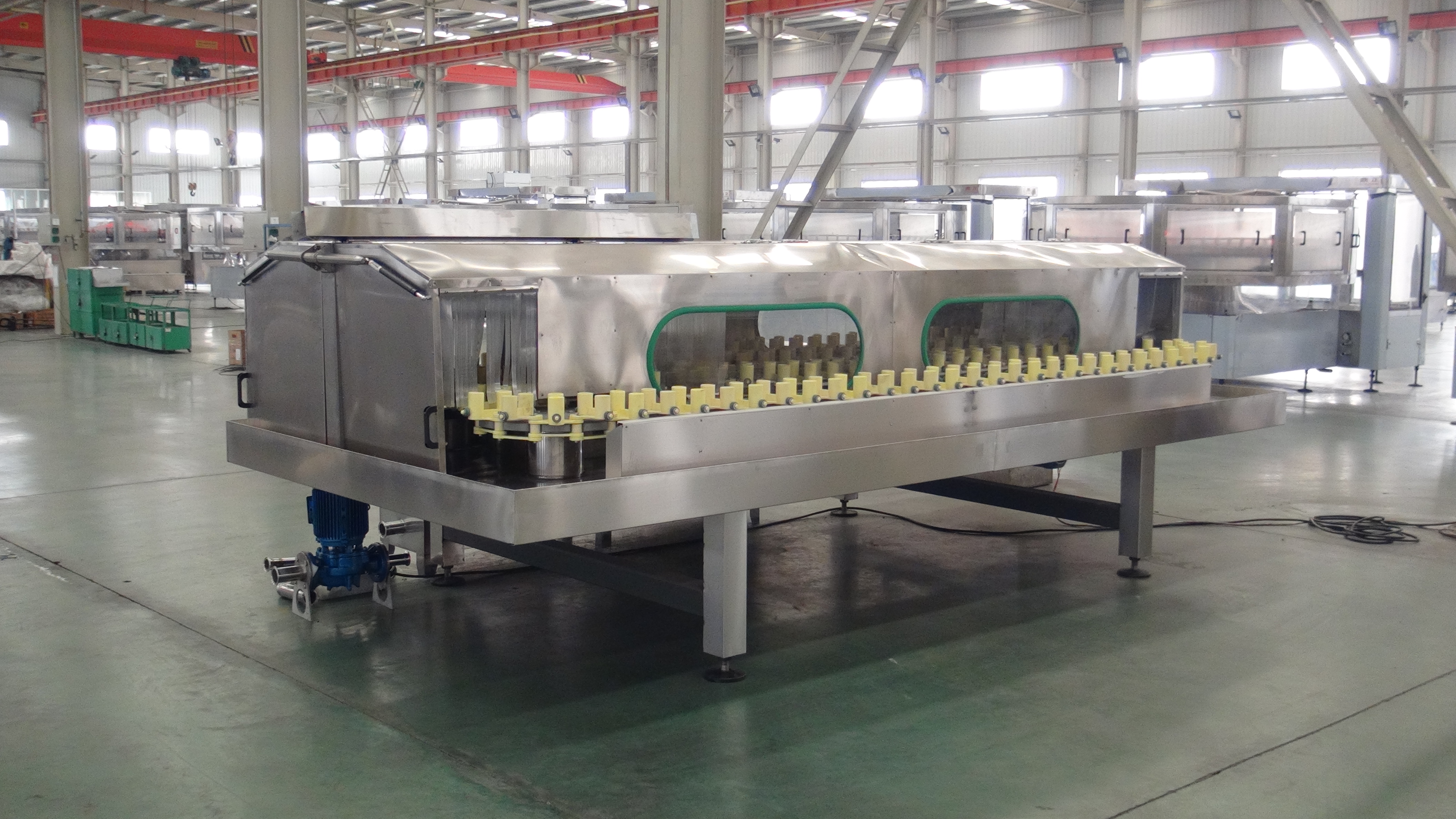 ●整機外觀美觀大方,機器外罩采用氣溫動撐桿結構,向上打開不需輔助工具,檢修保養(yǎng)方便。該款沖瓶機時傳統(tǒng)鑄鐵材料鏈輪 鏈條式?jīng)_瓶機的換代產(chǎn)品,不僅沖瓶時間長,并且配件費用大大降低,是中、大型企業(yè)理想的沖瓶設備。
